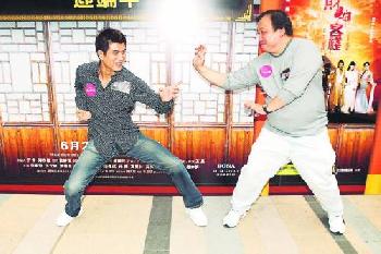 王晶與伍允龍昨日大曬功架為電影《財神客棧》宣傳。(圖:香港明報)