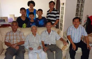 黃龍安(前右)率同小棋手到楊老府上,一行人合攝。前左起為李海星、楊鐵生、楊志標,後排左起為黃勇勛、吳秋揚、吳文滿、李詩光及楊老的兒媳婦黃麗雲。(圖:馬來西亞星洲日報)