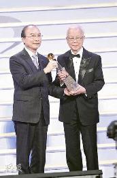陳百強父親(右)代表兒子從黃華麒手中領取“金針獎”。(圖:香港明報)
