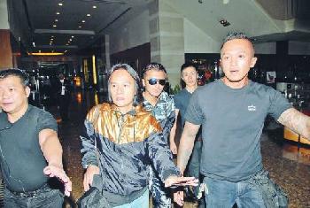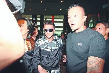 霆鋒有助手及多位彪形大漢護駕,仍擺出招牌Chok樣。(圖:香港明報)