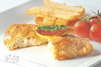 炸芝士火腿釀奶飼牛仔肉--奶飼的加拿大牛仔肉只帶微紅色澤和淡淡肉香,肉質十分嫩滑,釀入芝士及火腿炸香,十分惹味。(圖:香港明報)