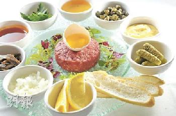 生牛肉韃靼--以加拿大西冷生牛肉製成韃靼,肉味香濃,配鯷魚、水瓜柳、香草、雞蛋及茄汁等拌食。(圖:香港明報)
