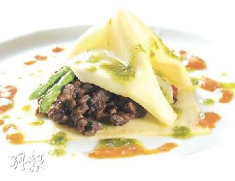 紅酒燴牛肋骨肉雲吞--加拿大牛肋骨肉含有筋及豐富脂肪,切條燴煮以保留口感,作為開面雲吞的餡料。(圖:香港明報)