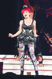 (香港)馬來西亞實力女歌手梁靜茹婚後再到紅館舉行一連三場演唱會,6月4日晚在紅館揭開序幕,向來走斯文抒情路線的梁靜茹以一頭紅髮現身,米黃色羽毛裝出場,她更大玩黃與紅色雙假髮,更有咖啡色髮型,還穿低胸裝跳勁舞,罕見狂野一面。