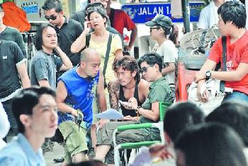 霆鋒則穿著黑色背心露出右手紋身,手纏著繃帶。未拍攝時他坐在藥房旁邊與工作人員研究劇本,心情不俗,但神情較嚴肅,不時視察拍攝情況。現場吸引逾200多名市民圍觀,一睹明星風采,有女粉絲更坐在附近食店不肯離開。其間聽到有圍觀人士大叫:“張柏芝會不會來?”但因距離太遠,霆鋒聽不到,但可見當地人都好奇他與柏芝的感情風波。