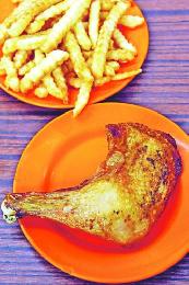 炸雞腿($12,1.50美元)及炸薯條($11,1.40美元),前者屬生炸,後者即叫即炸,均很香脆。(圖:香港明報)