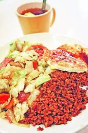 香辣米飯($33,4.20美元)--即是香辣豬肉加蔬菜加煎蛋,油分稍多,但仍見惹味。(圖:香港明報)