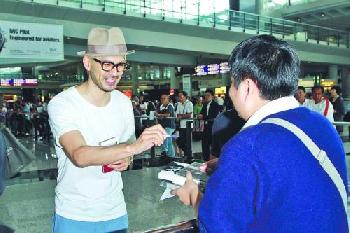 日本美聲天王平井堅抵達機場笑容可掬,十分親民。(圖:香港明報)
