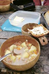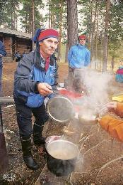 而我們果然如願以償,坐船不過是行程的一部份,下船後,我們漫步進入國家公園。在這裡,我們看到拉普蘭最典型的植物——松樹與地衣,松樹高聳入雲,地衣鋪天蓋地茂盛生長,整個空間幾乎都是綠色。我們踏著地衣而行,像踏著大地毯,腳下綿軟好走。風景依舊秀麗可親,最後走到湖前一小間木屋旁,Aslak三父子生火煮食,煲起鹿肉雜菜湯,桌上放滿麵包飲料、咖啡等。大家二話不說,找個好位置坐下來,吃午餐,享受風景。