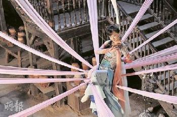 劉洋飾演財神客棧的老闆娘玉玲瓏,坐在彩帶上嫵媚誘人。(圖:香港明報)