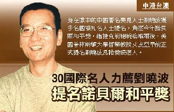 而捷克前總統哈維爾和40名國會議員1月已提名劉曉波角逐諾獎。兩名諾貝爾和平獎前得主達賴喇嘛和南非圖圖主教、世貿組織前總幹事莫爾等8人早前也發表文章,呼吁推動提名劉曉波諾貝爾和平獎。