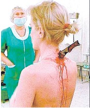 一把刀赫然插在朱莉婭頸部後面,但她對此卻渾然不覺疼痛,實令人驚訝!(圖:互聯網)