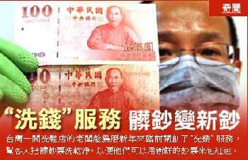 (台灣)台灣一間洗鞋店的老闆尤官正腦筋動得快,趁農曆新年來臨前開創了“洗錢”服務,當然不是違法勾當,而是幫客人把髒鈔票洗乾淨,以便他們可以用新鮮的鈔票來包紅包。