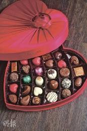 紅色緞面盒子,格調成熟。巧克力口味包括榛果蓉、巧克力醬及焦糖巧克力等。(浪漫心形禮盒巧克力$595/13粒裝,$1390/36粒裝)(圖:香港明報)