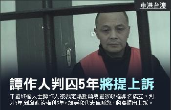 (中國)中國維權人士譚作人被裁定煽動顛覆國家政權罪名成立,判囚5年。譚妻和代表律師說,將會提出上訴。