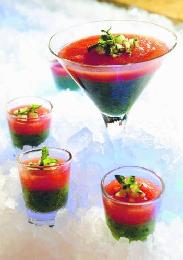湯也有冰凍的,一層紅一層綠的番茄青瓜凍湯口味清新,先喝下去是香濃清甜的番茄層,然後是一股清新芳香的青瓜味。凍湯賣相吸引,相信可輕易吸引不嗜蔬果的小朋友,而且做法也十分簡單。