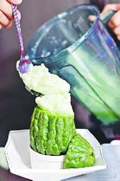 陳奕迅的一首《苦瓜》,一洗苦瓜土氣形象,原隻苦瓜冰冰更成為今夏最潮甜品。苦瓜做甜品,是否有點弔詭?常嚐甜品負責人譚先生說,苦瓜口味大受歡迎,而且不乏年輕人捧場,“我們選用兩種苦瓜,台灣白玉苦瓜甘味較重,加本地苦瓜,再混以蜜糖和北海道牛奶,味道香甜,年輕人都很有興趣”。的確,苦瓜冰冰加入各2安士的蜜糖和北海道3.6牛奶,味道清新且有回甘。