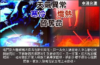 (香港)受東北季候風影響,香港天氣持續寒冷,天文台週三連續第5天發出寒冷天氣警告,預測週四(2月18日)早上溫度降至8℃。週三凌晨香港錄得8.2℃,再破入冬以來新低。寒冷天氣下,屯門及九龍城兩名長者在家中猝死,另一名女人瑞在老人中心昏迷送院後死亡,不排除因天氣寒冷引致病發死亡。