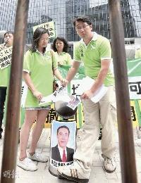 唐英年上週直斥有關警察保安違反言論及新聞自由的批評“完全是垃圾”,言論惹起爭議,民主黨多名成員,8月21日到添馬艦新政府總部門前抗議唐的言論,並即場將印有唐英年肖像的紙張撕碎丟入垃圾桶,寓意唐的言論是垃圾。(圖:香港明報)