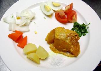 1.雞隻剁塊去骨,以黃薑粉、咖哩粉、食油、鹽與胡椒腌製4小時。