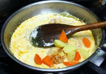 4.炒香蒜頭、番茄醬、桂葉、黃薑粉,拌入雞塊、椰漿與高湯,以鹽與胡椒調味,慢火煨25分鐘後,移入瓷烤盤內。
