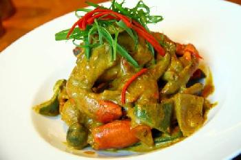 2.以熱油翻炒辛香料約一分鐘,加入螃蟹與咖哩醬料,拌炒均勻,最後撒入調味料,即可上桌。