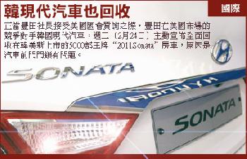 (韓國)作為底特律車企大股東的美國政府,近期就回收風波向豐田窮追猛打,其他進軍美國汽車市場的車廠,似乎也變得格外慎重。正當豐田社長接受美國國會質詢之際,豐田在美國市場的競爭對手韓國現代汽車,週三(2月24日)主動宣佈全面回收在韓美新上市的5000部王牌“2011Sonata”房車,原因是汽車前門門鎖有問題。香港現代汽車公司表示,香港並無發售涉事的車款。