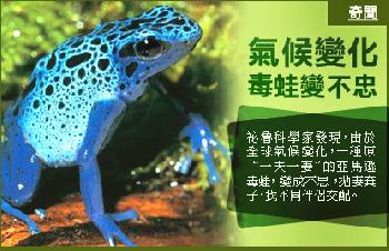 (祕魯)科學家發現,由於全球氣候變化,一種原“一夫一妻”的亞馬遜毒蛙,變成不忠,拋妻棄子,找不同伴侶交配。