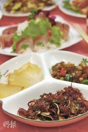 三色冷盤包括海豆腐(圖後左)、台灣鯛魚皮(圖後右)及海藻(圖前),當中的台灣鯛魚皮味道像海蜇,有嚼勁。(圖:香港明報)