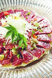 和牛薄切冷盤——薄切澳洲M9和牛,配以師傅自製的芝麻汁,香草味濃郁。(圖:香港明報)