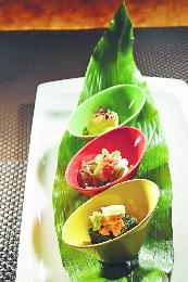 前菜拼盤——視乎每日的食材質素而不同,拍攝當日有蛋黃醬青柳(上)、長芋蓴菜(中)、海草果凍(下)。海草果凍、蛋黃醬皆自製,小口分量,非常精緻。(圖:香港明報)
