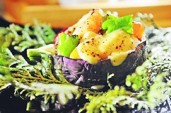 海鮮茄子田樂燒——賣相精緻,做法亦甚花功夫,日本圓茄子起肉後炸,釀入以味噌煮過的海蝦、帶子、提子等時令海鮮蔬果,再原個烘焗,帶點焦香惹味。(圖:香港明報)