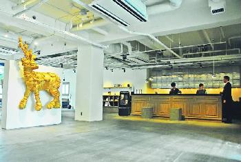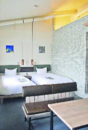 聰明的UDS沒有把宿舍的因子統統抹去:大部份房間都是單人房,保存學生宿舍的間隔;本來是食堂的餐廳保留了原來的不鏽鋼取餐長,大堂前後方的鋼柜是昔日學生的鞋柜,“我們稍後會把這些柜給常客使用,放些他們每次來都要用的東西”。酒店的藝術品亦充滿朝氣:大堂入口的“膠鹿”和後面的“膠虎”是新進藝術家名和晃平的作品,裡面包真的動物標本!每間房間裡也掛有藝術學院學生的畫作或攝影,附作者介紹,客人喜歡的話可以買下作品。