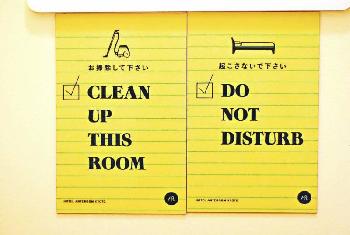 貼在鋼門上的“請勿打擾”磁石牌,特別設計成學生筆記本的樣子。(圖:香港明報)