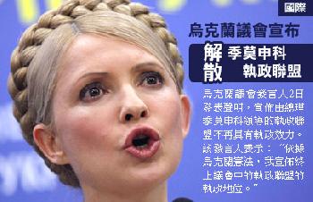 (烏克蘭)烏克蘭議會發言人2日發表聲明,宣佈由總理季莫申科領導的執政聯盟不再具有執政效力。該發言人表示:“依據烏克蘭憲法,我宣佈終止議會中的執政聯盟的執政地位。”