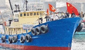 世界華人保釣聯盟10名成員1月3日下午從香港筲箕灣乘“啟豐二號”出發前往釣魚島,但被海事處指有理由相信此船並非用作捕魚,不准漁船離開香港水域。(圖:香港明報)