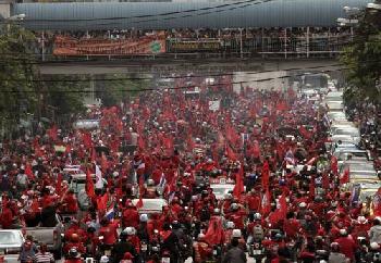 (泰國‧曼谷)泰國前首相塔辛連日來通過錄影呼吁更多民眾參與紅衫軍示威活動,現任首相阿比希化守勢為攻勢,接受外國媒體訪問砲轟塔辛。阿比希並承認,泰國目前是個分裂的國家。