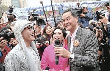 香港特首參選人梁振英(右)1月28發表聲明回應,唐英年說他“沒提出扶貧意見”與事實不符,又認為貧窮惡化已成事實,批評唐英年作為扶貧委員會主席實難辭其責。(資料圖片)(圖:香港明報)