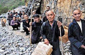 在旱魔蹂躪下,加上山路崎嶇,路未修通,送水車無法進入村內,村民不想渴死,每天不得不拄著柺杖,往返20多公里的崎嶇山路,挑水回家。