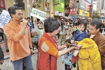 梁振英(左)和太太唐青儀(左2)2月12日在銅鑼灣請市民簽名支持。(圖:香港明報)