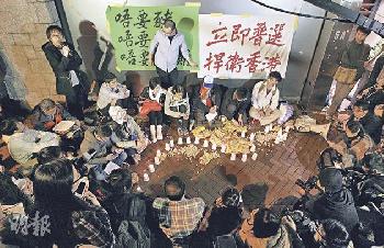 (香港)20多名網民青年響應網上發起的“全城默哀,向小圈子選舉開戰”行動,2月21日晚到唐英年位於九龍塘約道5A及7號大宅外舉行燭光晚會,燃點燭光及拉起“立即普選捍衛香港”的橫額,同時在門外“剝花生”,寓意小市民未能參與特首選舉,只能觀戰做“花生友”。