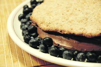 榛子蛋白糖搭配巧克力慕絲--Iben丈夫Ton做的榛子蛋白糖(meringue)搭配巧克力慕絲配藍莓,有餐廳水準。(圖:香港明報)