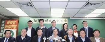 終極普選聯盟昨日召開記者會,公佈經修改的政改方案建議,當中包括2020年立法會一半議席分別由分區的比例代表制產生,一半交不分區的比例代表制產生,未來爭取市民支持方案;前左起:何俊仁、馮檢基、蔡耀昌、馮偉華、馬嶽、楊森及張文光;後左起:狄志遠、李健勤、葉健民、李芝蘭、黃碧雲及陳健民。 (圖:香港明報)