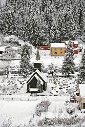 The Flam Railway途經的小鎮,房子、教堂、墓碑、松林……被白雪粉飾得如模型般精緻。(圖:香港明報)