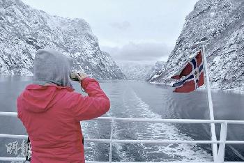 都說夏天是最佳旅遊季節,但披雪的挪威,更見純淨寧謐。2月初,從天微亮的奧斯陸,登上早上8:11往卑爾根的列車;火車車窗,成為映畫屏幕:挪威第5大湖Tyrifjorden繚繞的水氣,數不盡的雪松,高原深及屋頂的積雪。轉乘仿古的The Flam Railway火車,像電影裡的北極快車(Polar Express),穿越冰山雪谷,條條像被急凍的瀑布掠過眼前。轉上遊船,一進入Nærøyfjord,水變得非常靜,像面烏亮的鏡,映照千米高的雪山。我們和一家三口俄國人,是船上僅有的遊客,這時更見安靜,大概在想同一件事:上天給挪威最厚重的禮物,不是北海石油,而在我們眼前。