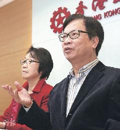 工聯會會長鄭耀棠(右)和副會長陳婉嫻(左)3月22日宣佈,工聯會25日會全票投給梁振英,鄭耀棠表明反對流選,指“香港內部的消耗,是香港付不起的代價”。(圖:香港明報)