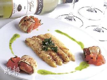 芝士焗白蘆筍伴帶子帕爾瑪火腿——白蘆筍灑上Pamerson芝士,焗出濃濃的香味,由帕爾瑪火腿裹的帶子,對不起,這一回你要淪為配角了。(港幣230元,a)(圖:香港明報)
