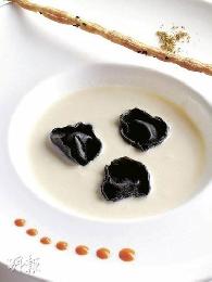 意大利墨魚汁雲吞伴白蘆筍濃湯——洋湯底加上白蘆筍的湯,沒想像中的清淡,反而濃郁而鮮味。(港幣160元,a)(圖:香港明報)