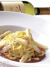 自製麵條配白蘆筍煙肉及吞拿魚——新鮮的自家搓製蛋麵,香氣非凡,伴清鮮細嫩的白蘆筍,如魚得水。(港幣240元,b)(圖:香港明報)