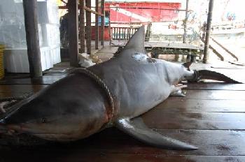 2009年11月2日,吉打的漁民捕獲了一條7呎長、約150公斤的大鯊魚,帶回吉打港口漁行,4名漁民費九牛二虎之力才將大白鯊從漁船搬到岸上。(圖:大馬星洲日報)